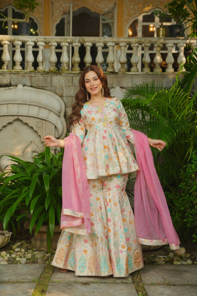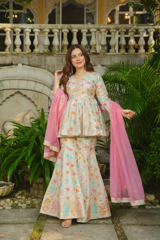 Rajwada Glow silk peplum top , sharara with duptta